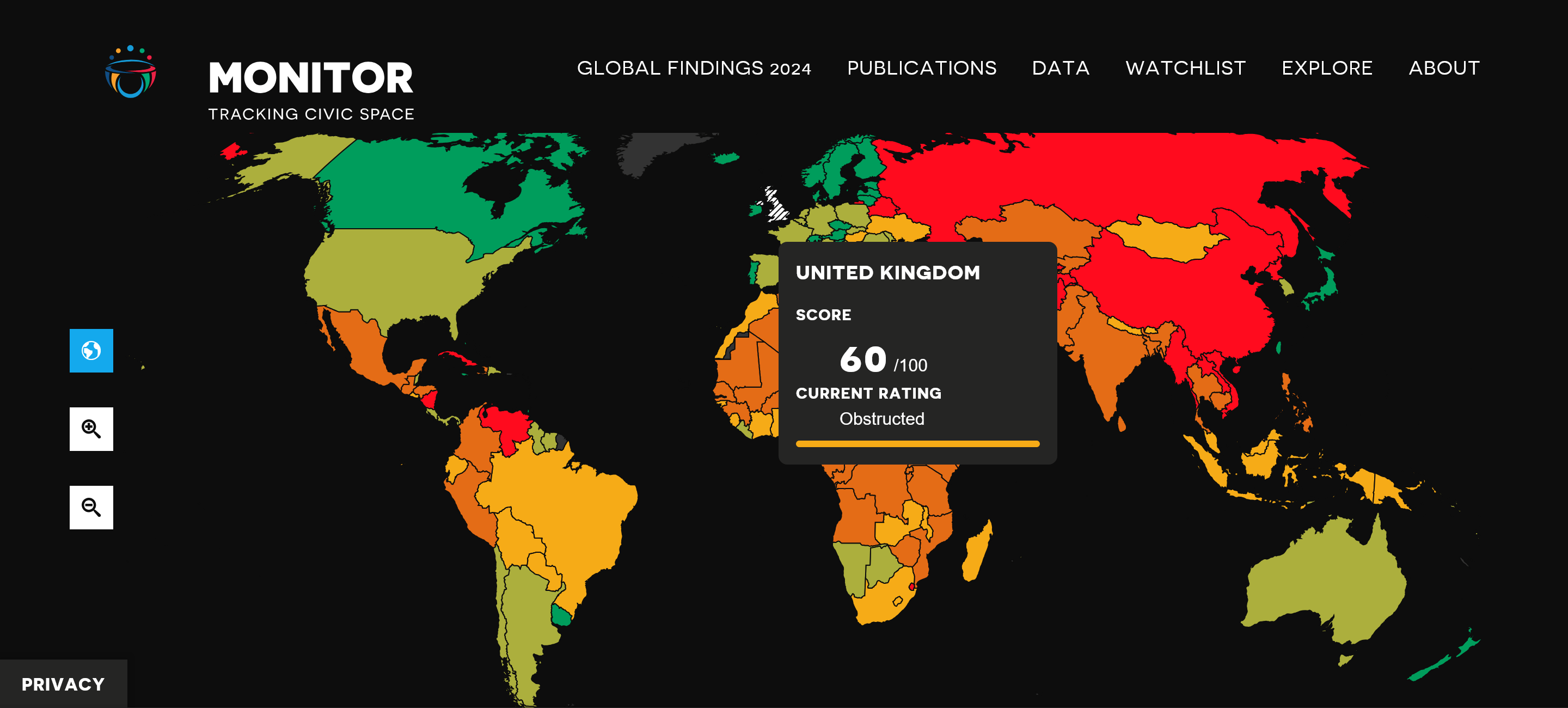 In 2023, the CIVICUS Monitor downgraded the UK’s civic space rating from 'narrowed' to 'obstructed'. This places the UK in the same company as El Salvador, Hungary, and Serbia, where protest rights, press freedom, and civil society are all under active threat.