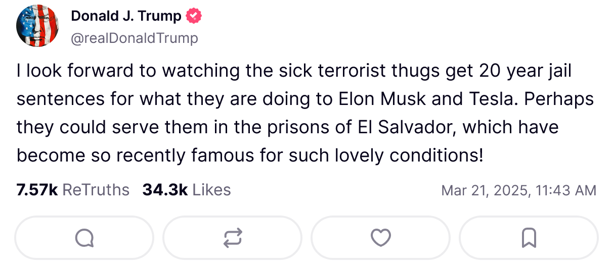 And the punishments are escalating. After property damage at the recent Tesla protests — typically a misdemeanour — the FBI launched a domestic terrorism task force to investigate. Five activists are now facing prison sentences of 5 to 20 years. Trump posted on Truth Social that he hopes they receive the maximum term — and serve it in El Salvador’s CECOT prison.